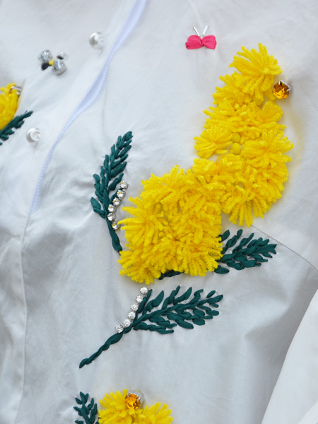 こちらはふわふわと立体的なミモザのお花に、朝露を思わせるようなラインストーンが葉に施されたこだわりのデザイン。