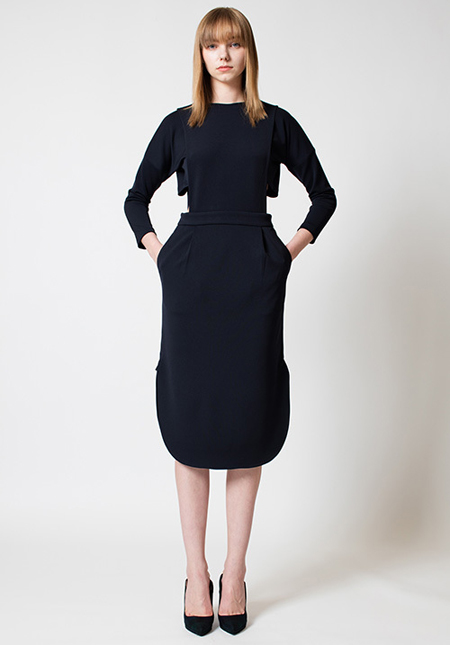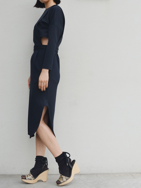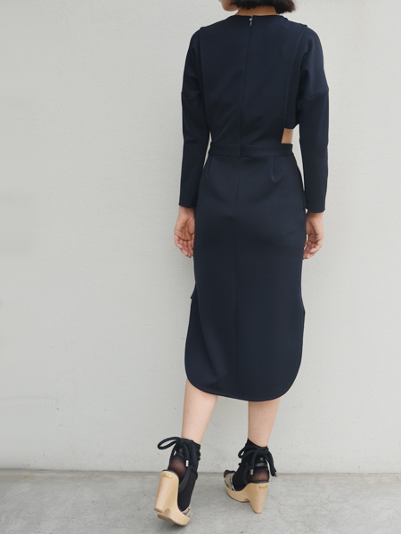 サイド部分は大胆にも大きくカットさせており、ショート丈のトップスの上からジャンパースカートを重ねているようなデザインになっております。