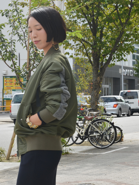 HugeのLOOKや最初の写真ではヒールを合わせて品良く着ているのですが、こんな感じで秋口にはブーツでカジュアルに。