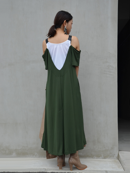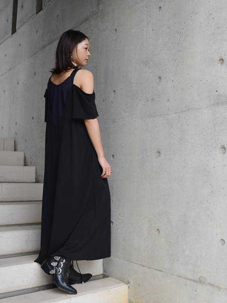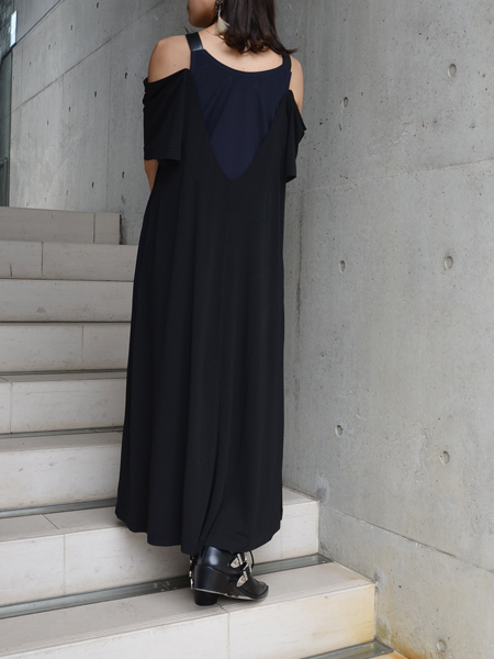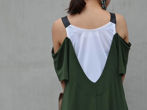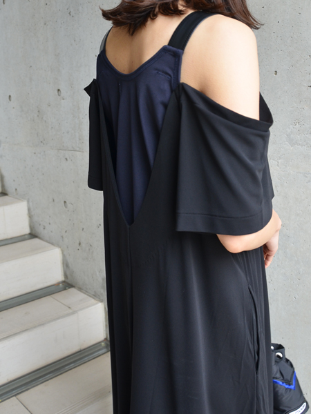 バックスタイルはタンクトップに、オフショルのワンピースを重ねた様なデザインに。