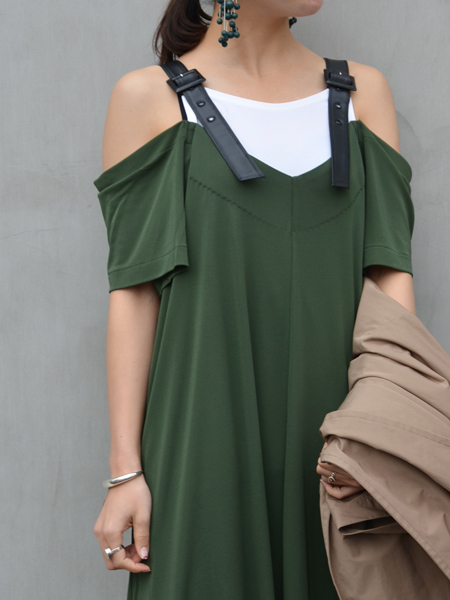 オフショルダーのワンピースに、ノースリーブトップスを重ねたようなデザインがユニークな1着。