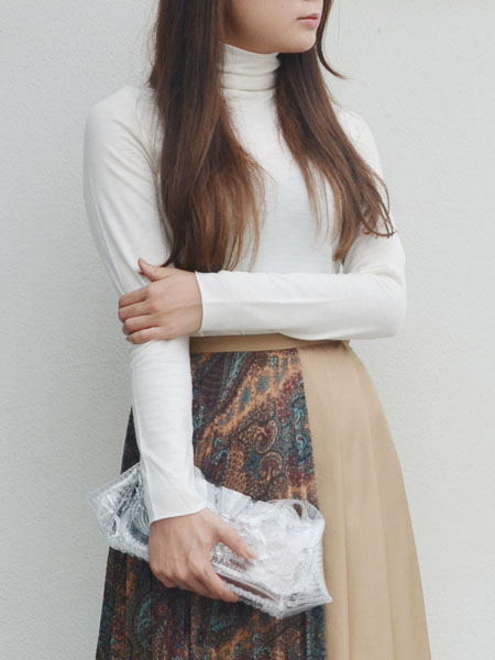 短めのハイネックから、折らずにそのままにして防寒仕様にとT.P.Oで変化させて着ていただけます。