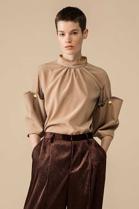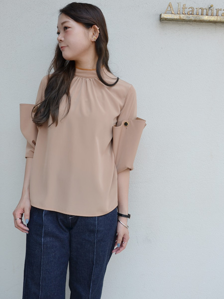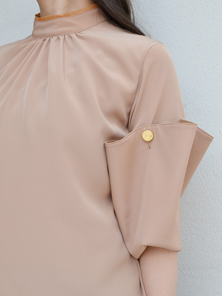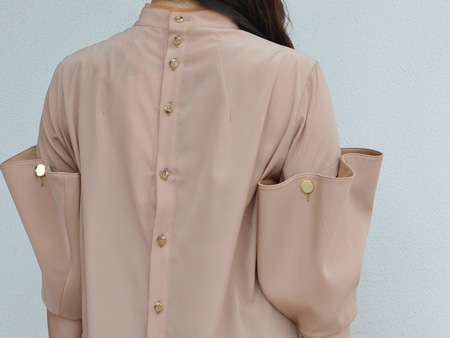 大きく開いたベルスリーブをそのまま折り返してボタンで留めたようなデザインになっております。