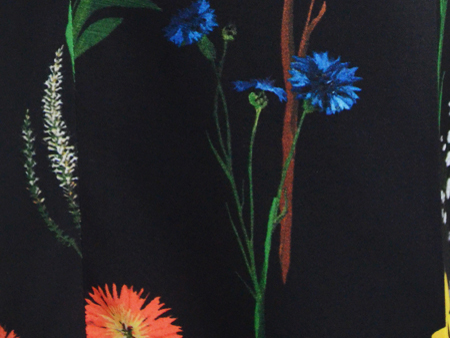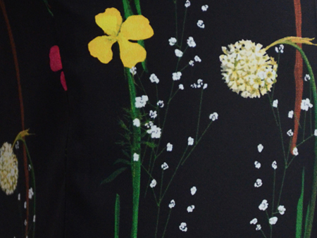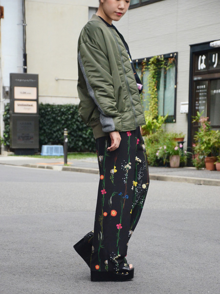 黒地に浮かぶ鮮やかなボタニカルプリントは、華やかですが主張しすぎずアンニュイな雰囲気。まさにAKIRANAKAのお洋服を着る女性像にピッタリです。