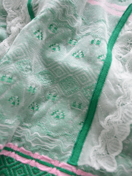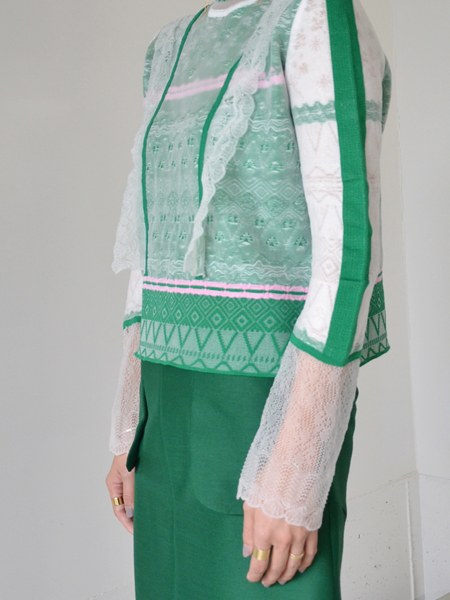 白のジオメトリック柄の上から透けるニットを重ね、グリーンのラインを入れています。