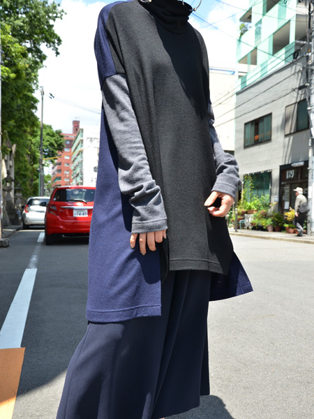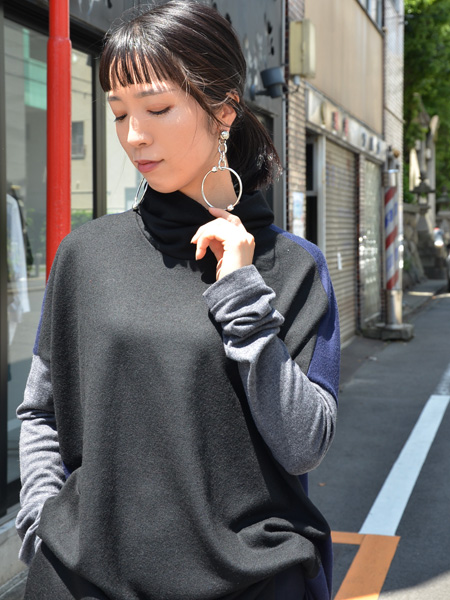 ずるっとルーズなシルエットにモードな色使い、1枚でもレイヤードしているかのような雰囲気を楽しめるハイネックトップスです。