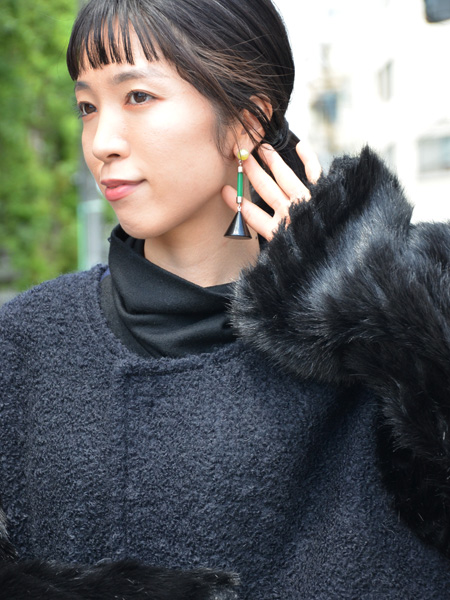 かなりクールなアウターに、アクセサリーはBijouのポップかつエッジィなピアスで。