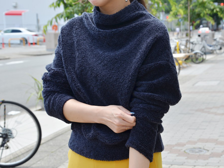 モックネックのトップスはこちらも軽くて暖かいループ起毛。