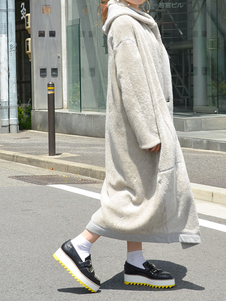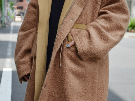 ロング丈のモッズコート、素材はループモヘアなのでワーク感に上品さがプラス。
