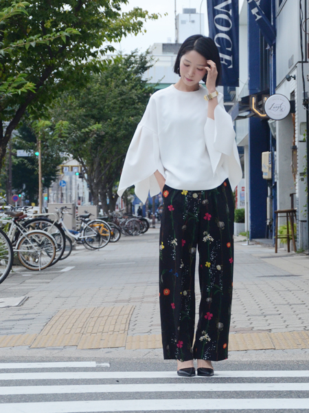 袖にフリルがついたデザインはとくに今年多く見かけますが、袖自体がツボミになった斬新なデザインは珍しい。
