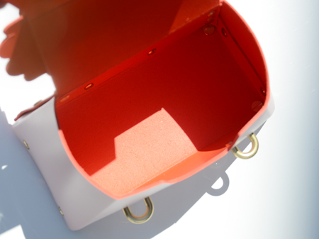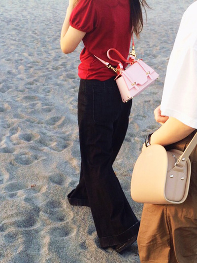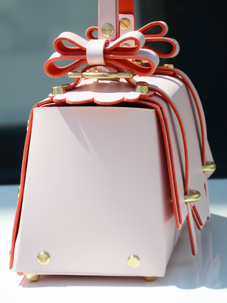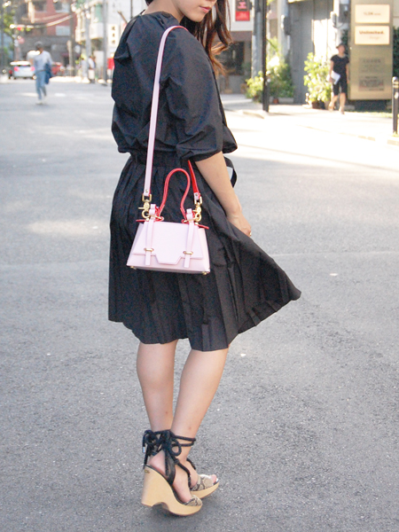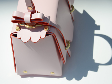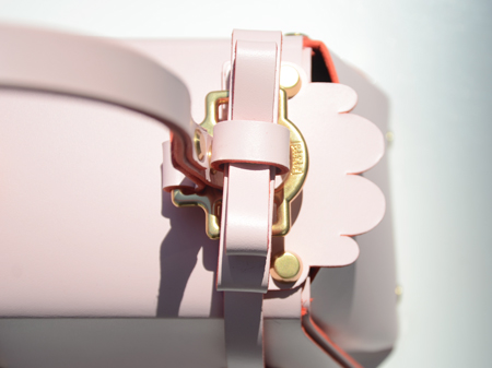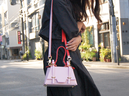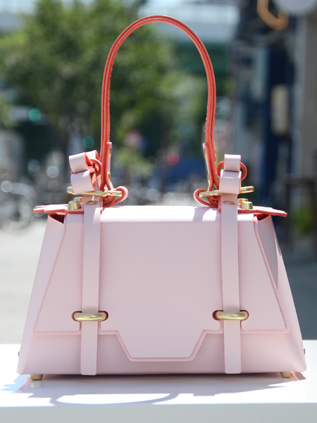 さらにはbaby pinkという色なので、本来なら少女的な可愛さになりがちなのですが、素材がレザーであることや、レザー裏側に着色された赤が効いて、どこか強さを感じます。