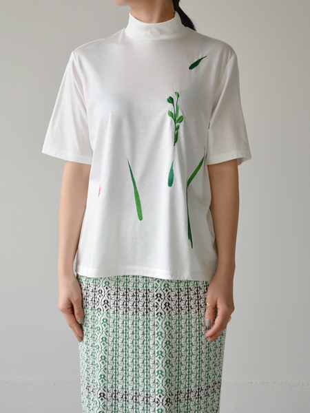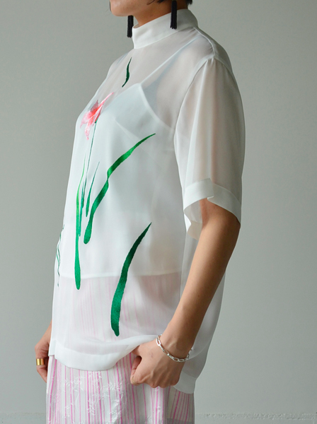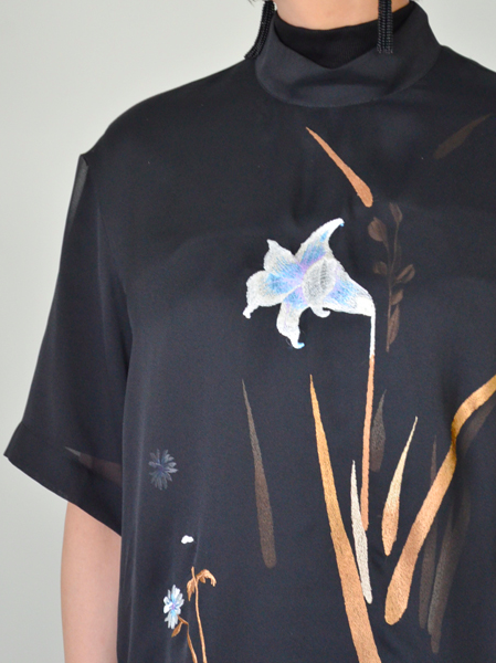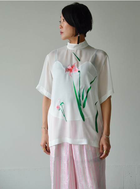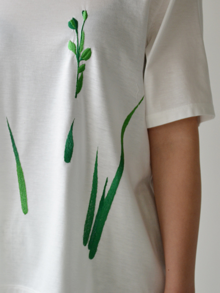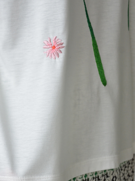 百合をメインに刺繍されたシフォン生地のトップスと、シャープな葉が刺繍が入ったカットソー。