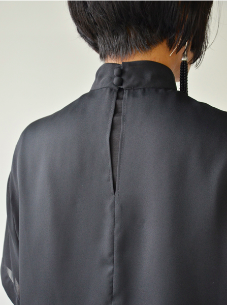 スタンドカラーで後ろにはくるみボタンが並びます。