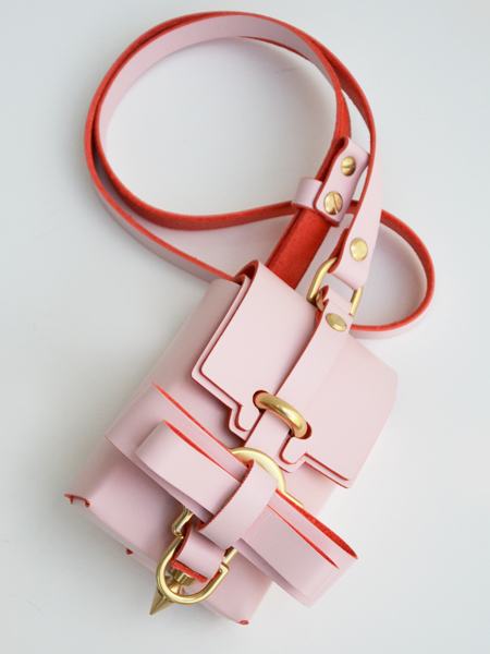 世界観たっぷりのpinkですが、レザーの裏側は赤になっているためbaby pinkとredのバイカラーといった雰囲気。