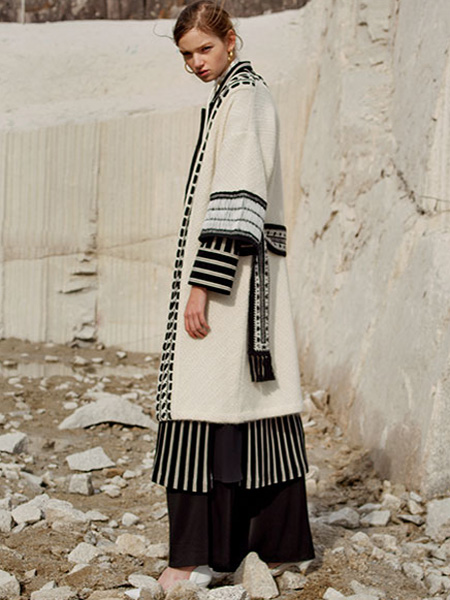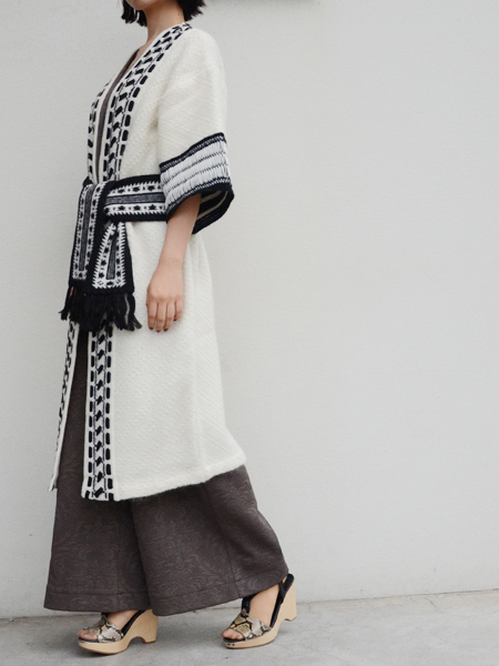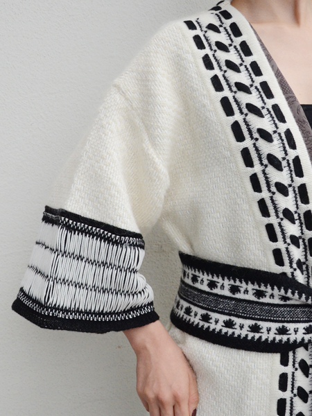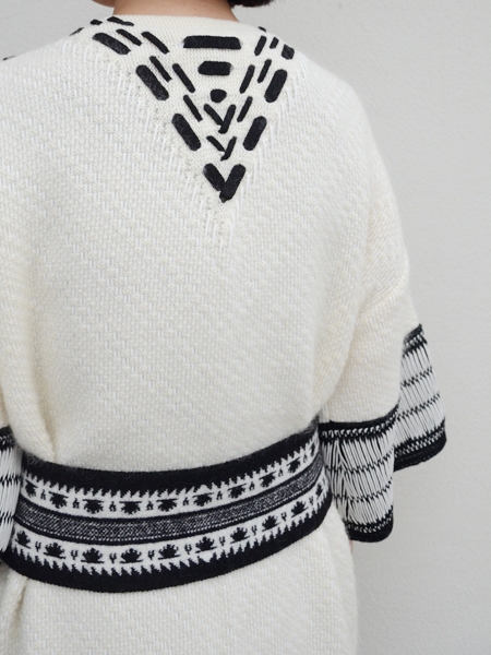 襟元から裾までmame独特の繊細な編み目に太めのステッチを合わせた装飾。