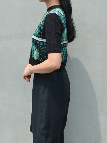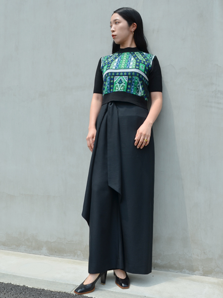 肌寒い日のガウンやアウターから覗く柄は存在感があり、首に沿うスタンドカラーのクラシカルな襟元もポイントに。