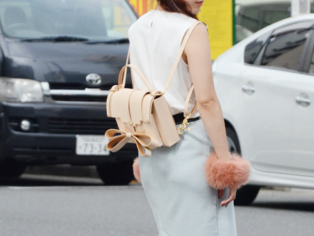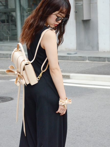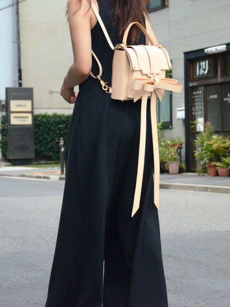 バッグのフロント部分から飛び出る大きなリボンも特徴のひとつ。