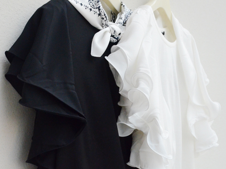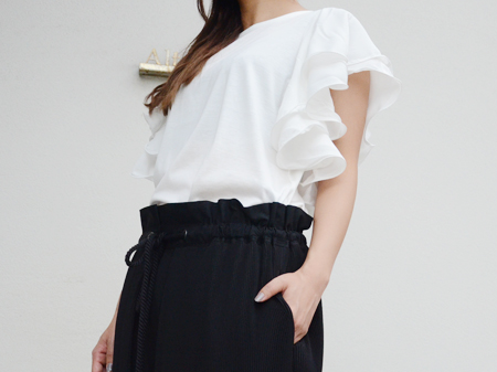 袖の大胆なフリルが、気になる二の腕をしっかりカバーして細く見せてくれます。