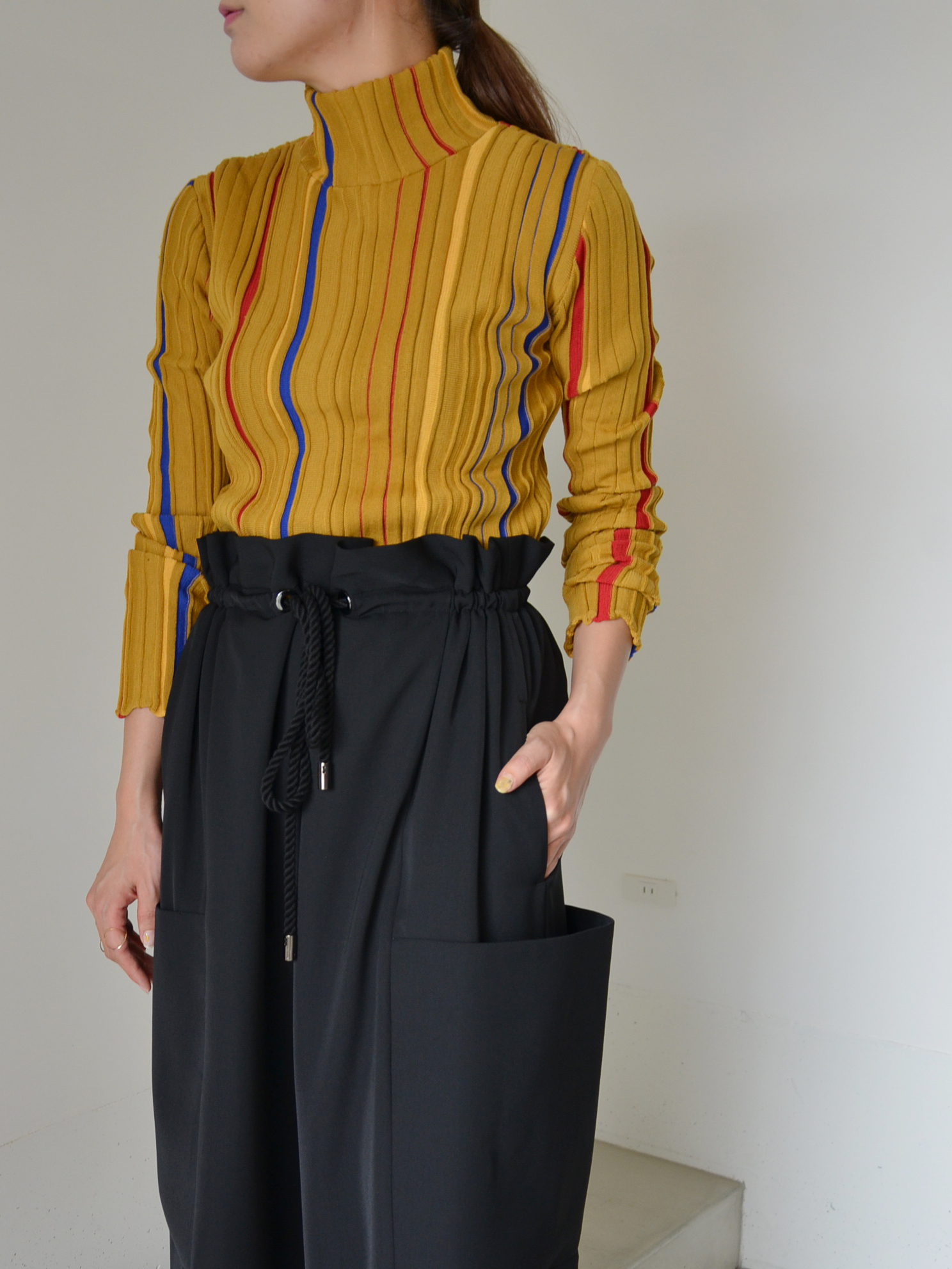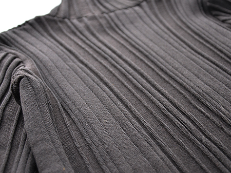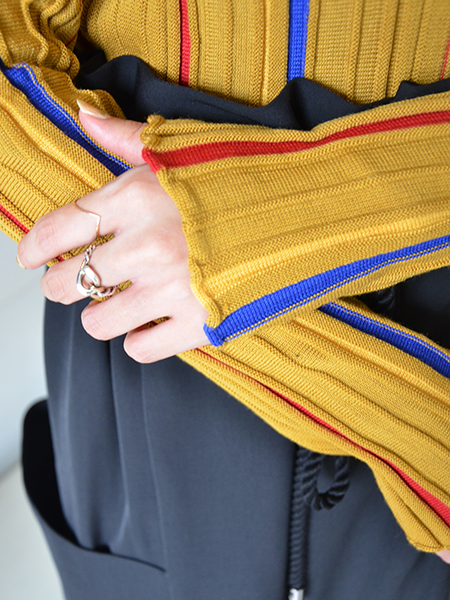 ボーダー状に編み立てたものをストライプ状に使用することで、通常のリブでは表現できない立体的な凹凸を出しています。