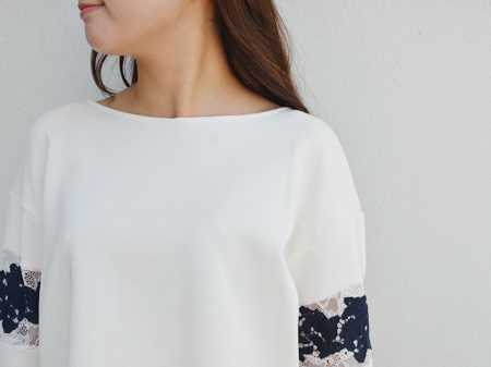 リラックス感あるボートネックと、肩が落ちたパターンは余裕のある女性らしさを醸し出します。