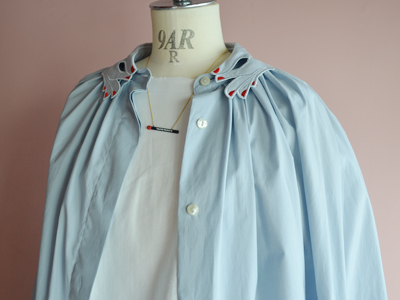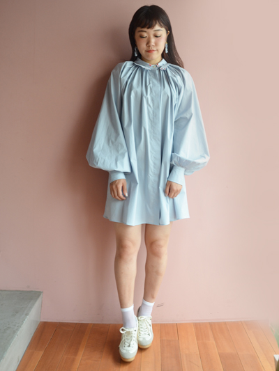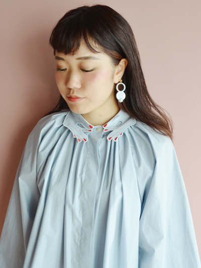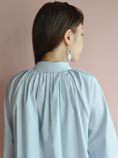 ユニークなハンド襟と、襟元に寄せられたたっぷりのギャザーで、立体感が生まれる面白い1着。