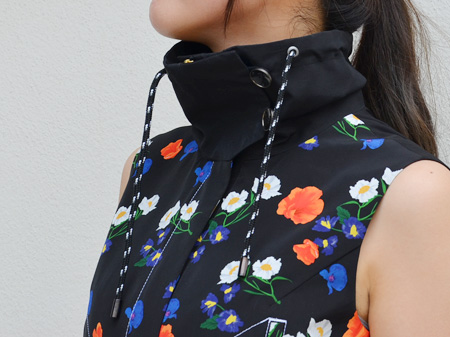 パーカーでよく見る紐と同じ様なデザインを加えたハンサムなハイネックデザインが特長。スポーティー要素も含まれていて、ボタニカル柄なのに媚びていないデザインがすごく魅力的ですね。