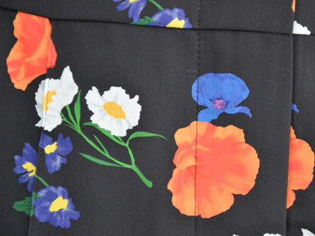 オレンジ、ブルー、ホワイトとブラックの生地に映えるノスタルジックな花柄のプリントが華やかで上品。