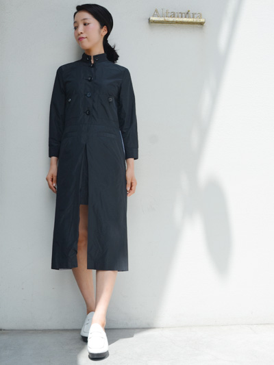 女性らしいワンピースにスタンドになった襟がハンサムで、このバランスが素敵です。