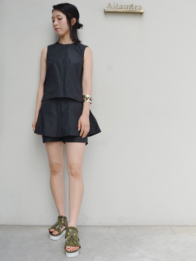 セットアップで合わせたボトムはスカートに見えるショートパンツ。