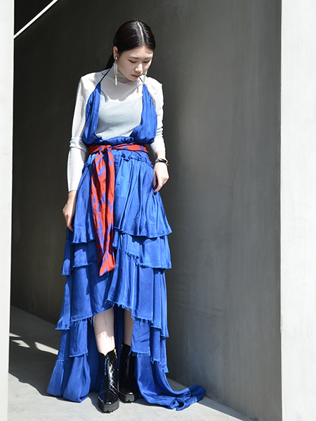フロントは短めの丈になっていて、バックはロングスカートなので美脚効果がすごい!