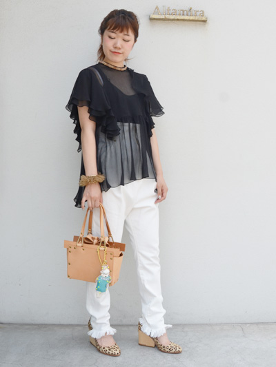 今期注目されているシースルー素材に、首元にはビーズと麻の装飾がアクセントになった、ガーリーなトップス。