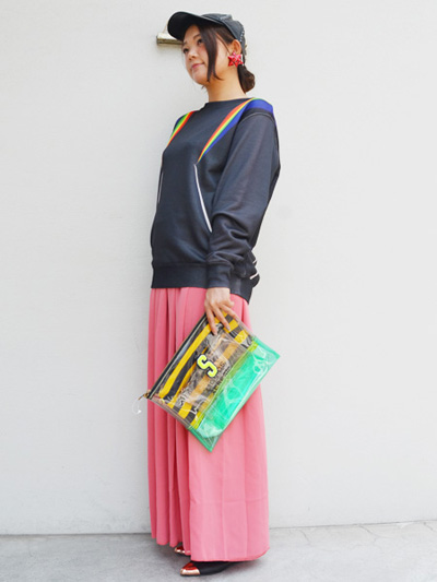 Monk New Yardのマキシスカートはピンクとグリーンの2色展で、夏にぴったりのビタミンカラー。
