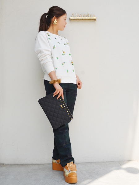 華やかなMUVEILのビジュースウェット。同じく、MUVEILのチェックチノパンで秋口を意識したコーデを組んでみました。