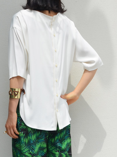トップスで合わせたシャツは背中がボタンになったデザイン。