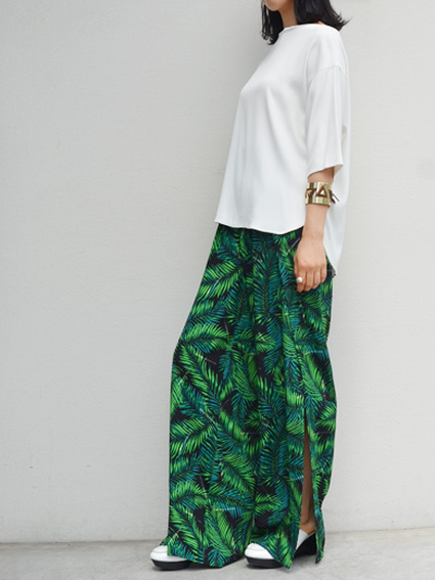 トロンとした生地感が気持ちいいシャツに、インパクトのある夏らしい派手柄のパンツのコーディネート。