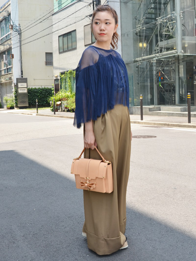 例えばこんなに風に、トップスや小物にインパクトのあるものを持ってきても、パンツがうまーく調和してくれます。