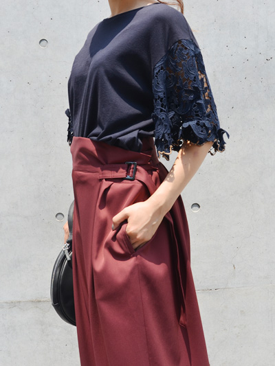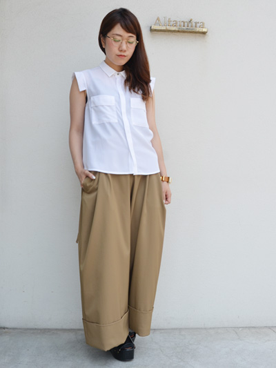 言葉に起こすと、シンプルすぎて、私には似合わないかも…と思いましたが、しっかりインパクトのあるパンツなので、シンプルなコーディネートは着慣れていないお客様にもおすすめしたいアイテムです。