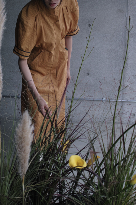優しい牧歌的な雰囲気の中に、引き締め効果として裾スリットやトリプルステッチ、カシメやレザーディティールで優しくなりすぎないように絶妙なバランスの調和を目指しました。