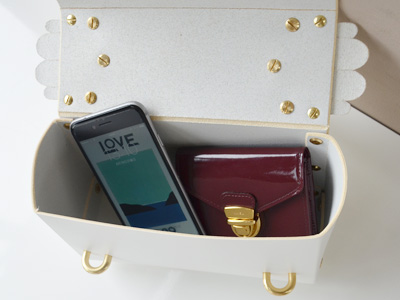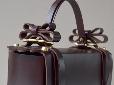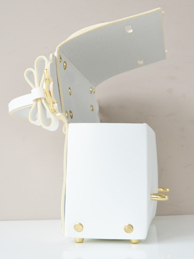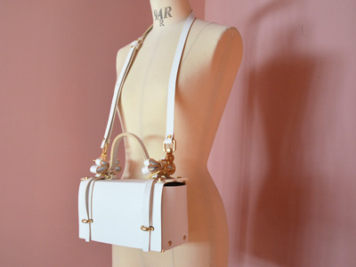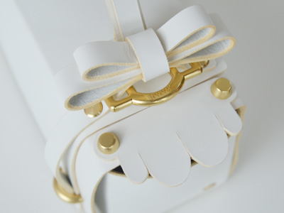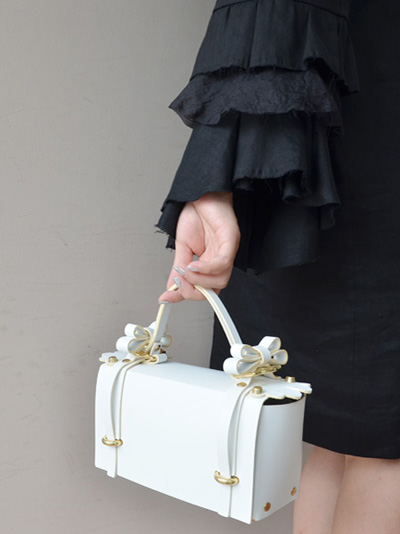 プレゼントボックスのようなシルエットが印象的なWINGED BAGですが、もうひとつの特徴はバッグ両サイドのリボンと、羽根のような可愛らしいスカラップ装飾。