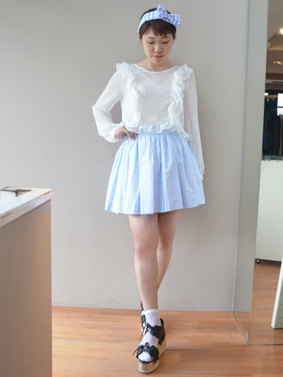 こんな感じで、甘さを抑えたトップスと合わせると雰囲気も変わります。