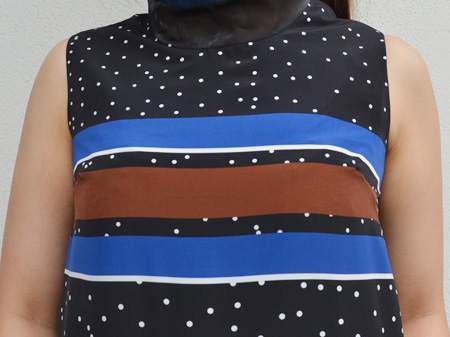 白い小粒のドットがパラパラと不規則に散りばめられ、胸元には太めのボーダーが大胆に3本入ったメリハリのあるオリジナルプリント。