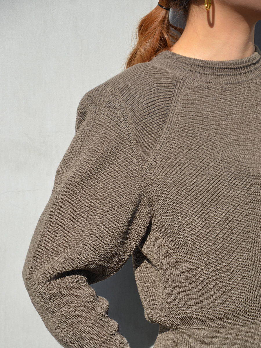 PHOTOCOPIEUらしい今季のフォルムを取り入れた、肩パッドの入ったコンパクトなニットプルオーバー。