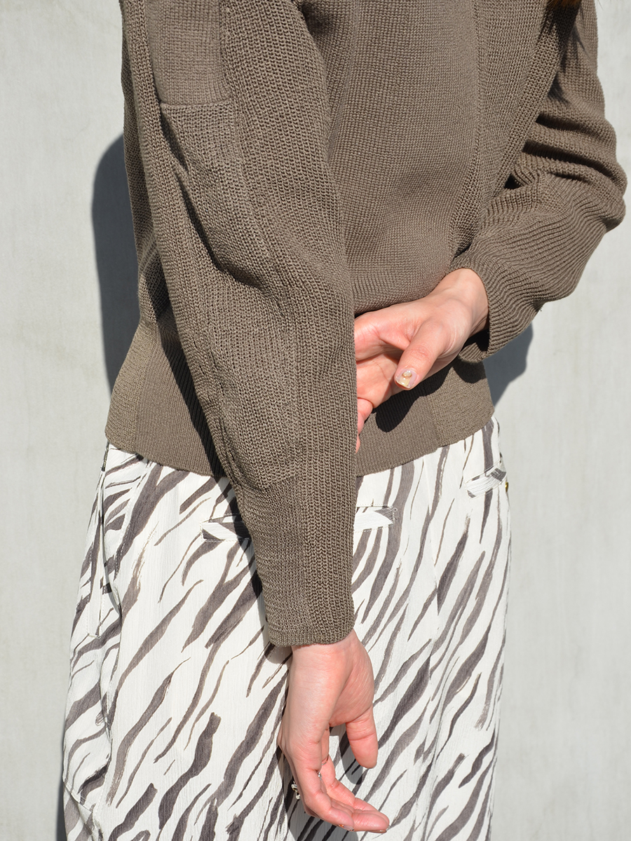シンプルにフォルムを作ったニットではありますが、2種類の糸(綿糸、綿麻糸)をパーツによって使い分け、切り替えによる2素材のタッチと、編み地のコントラストがデザインのアクセントになっています。