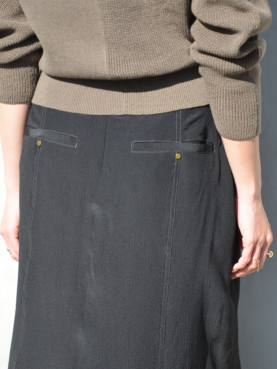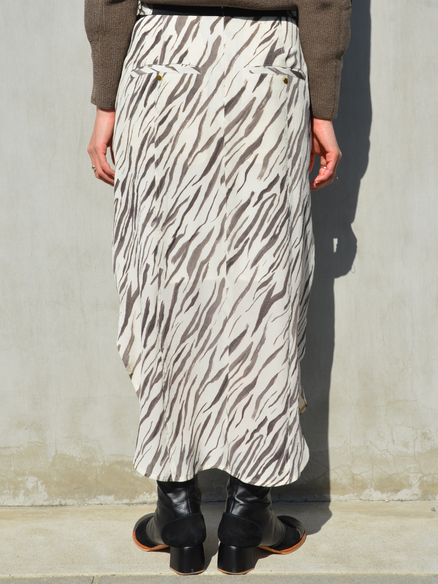 スカートに使用されている国内高級楊柳シルク生地は、先程ご紹介したホワイトタイガー柄と同じで、製品洗いを施し粗野な印象に仕上げています。