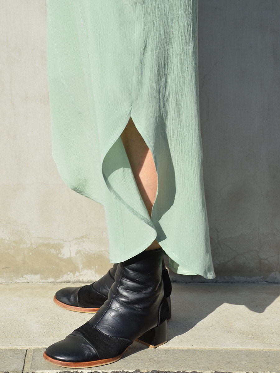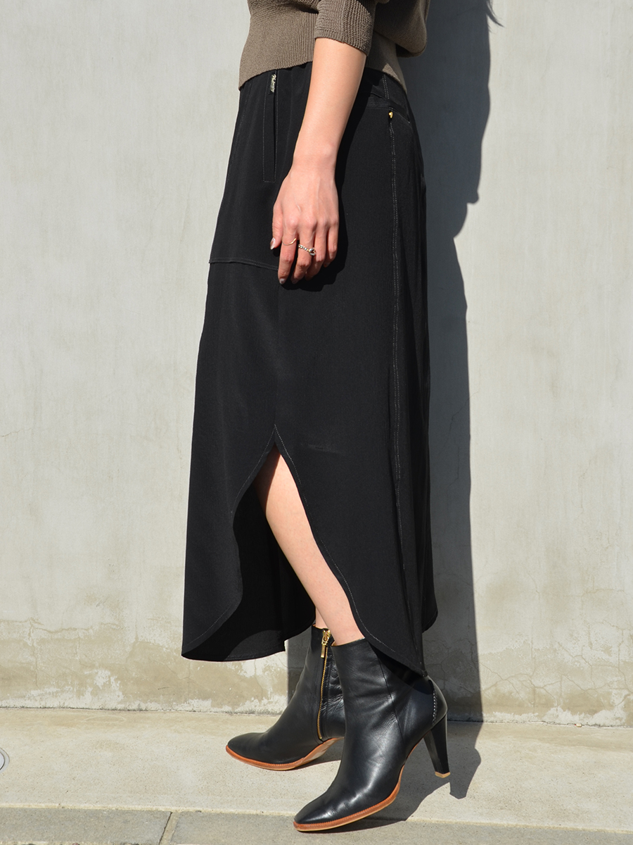 深めのスリットにラウンドした裾が足元を女性らしく演出してくれますよ。