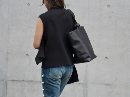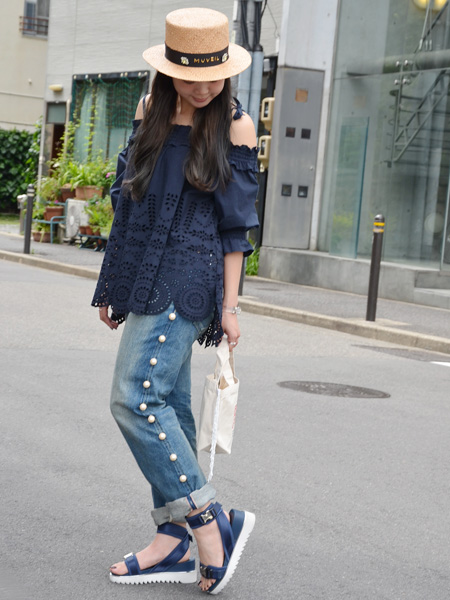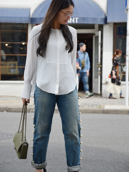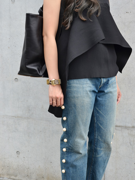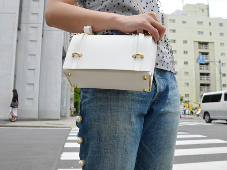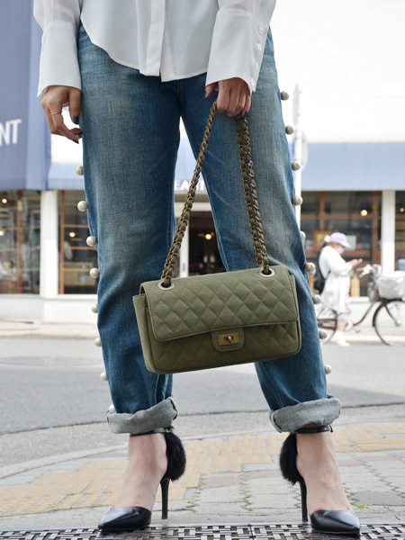 デニムを飾る純白パールとニールスのバッグが雰囲気ともによく合います。