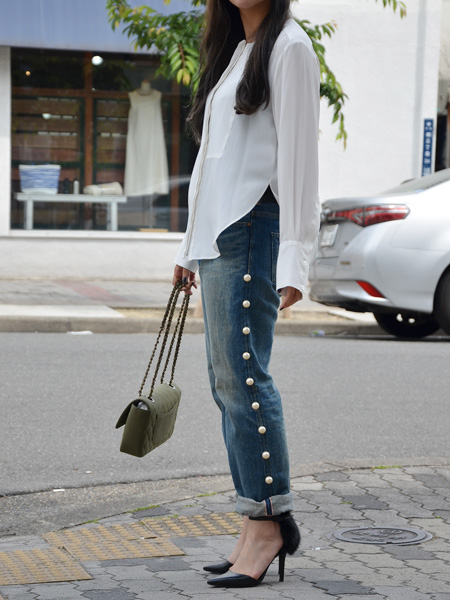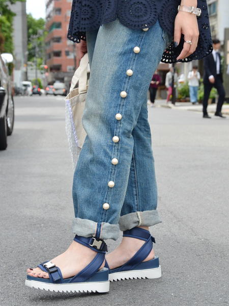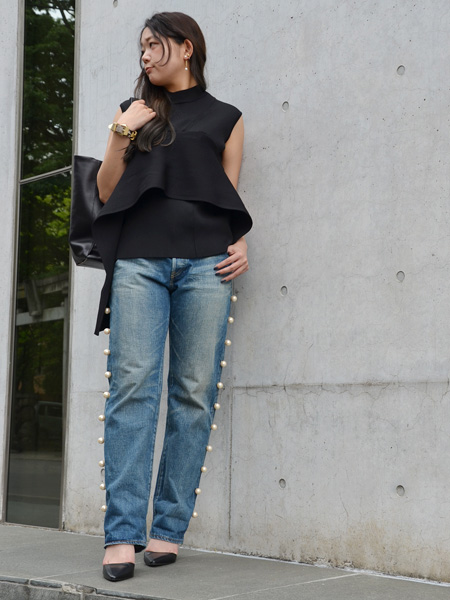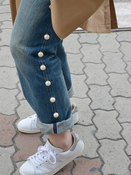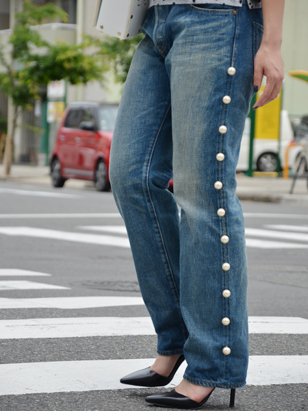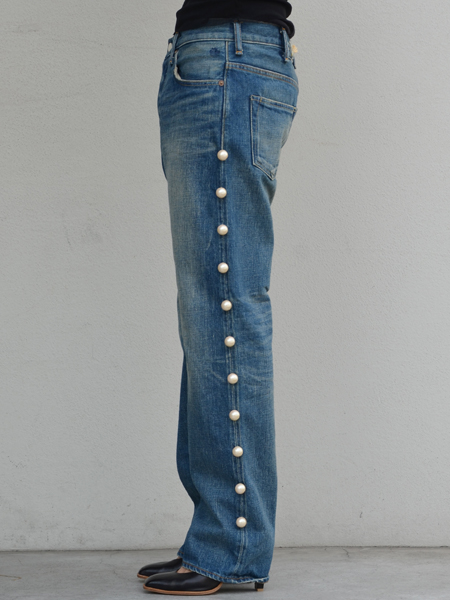 両サイドに均一に並んだパールがポイントのボーイフレンドデニム。