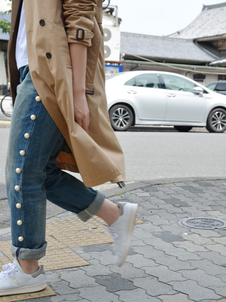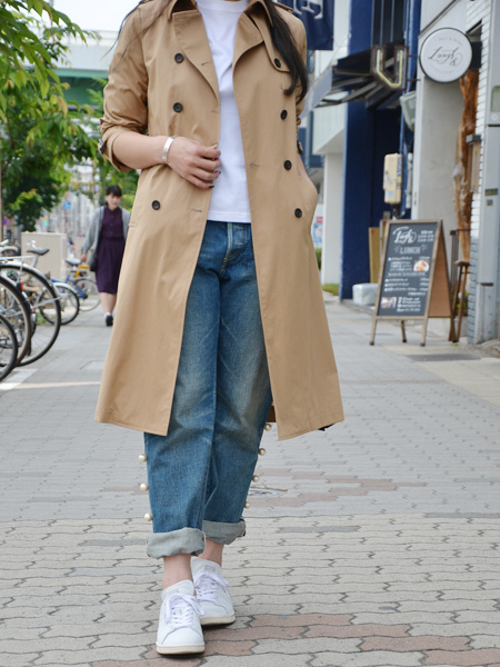 トレンチコートに白T、スニーカーで軽快に、見えてないのですがベレー帽合わせてます。トレンチコートから見えるパールがまた可愛い!!!!