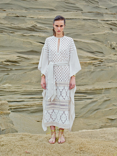 スカート部分にラインのように入っているのは、旅先で出逢った連なる峰々が織りなすランドスケープから着想を得たというトライバル柄。
