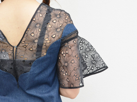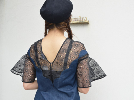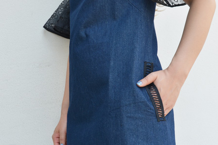 定番アイテムでもあるカジュアル素材。デニムと上品な黒レースを贅沢に使ったワンピース。